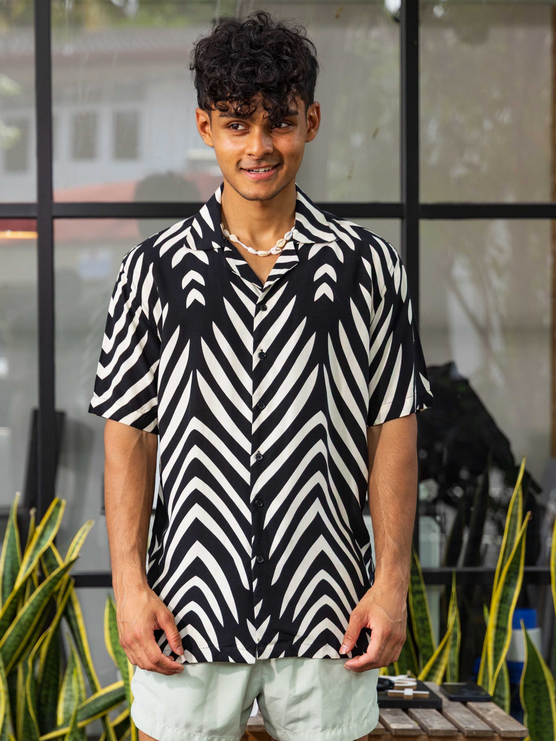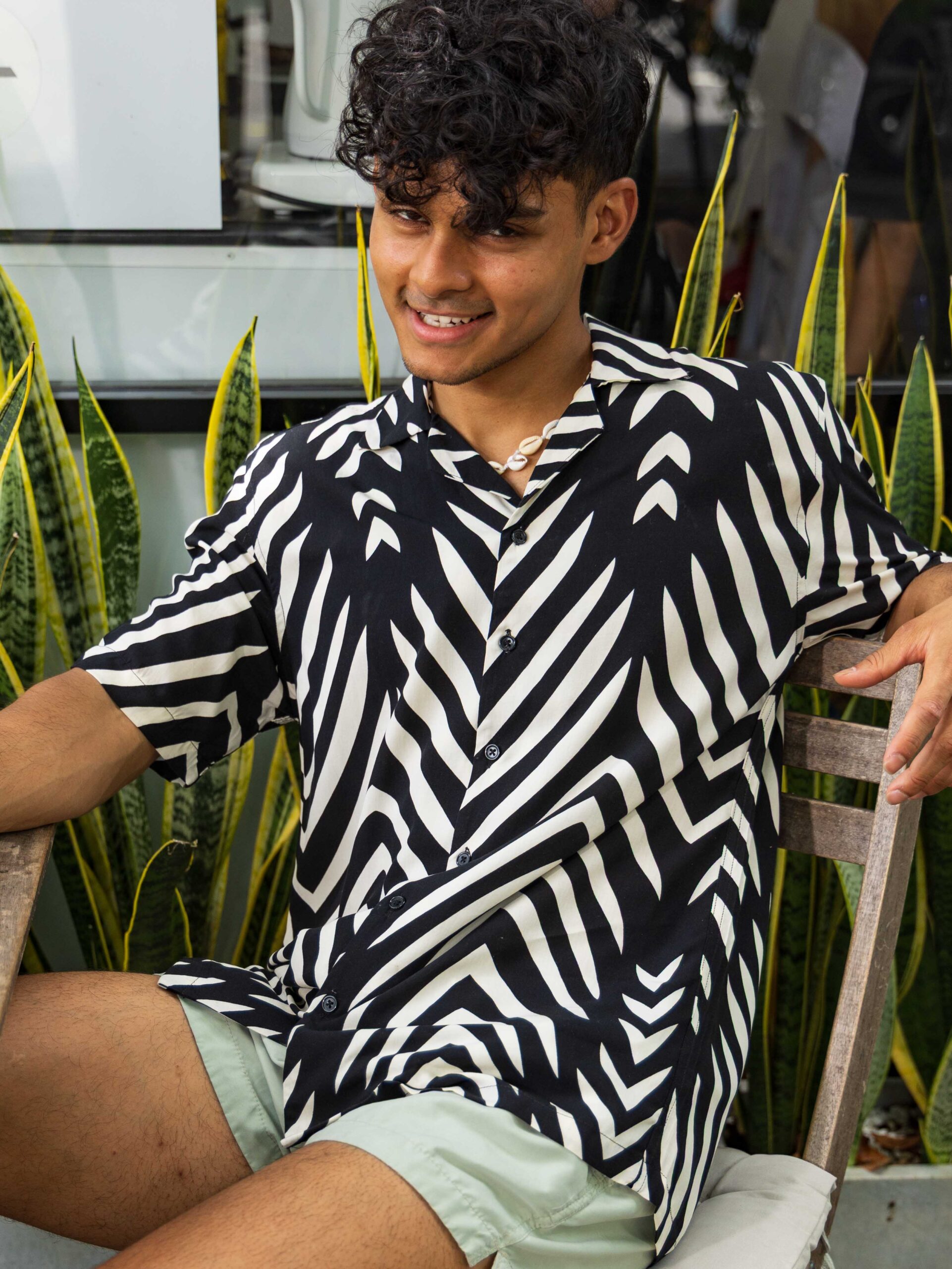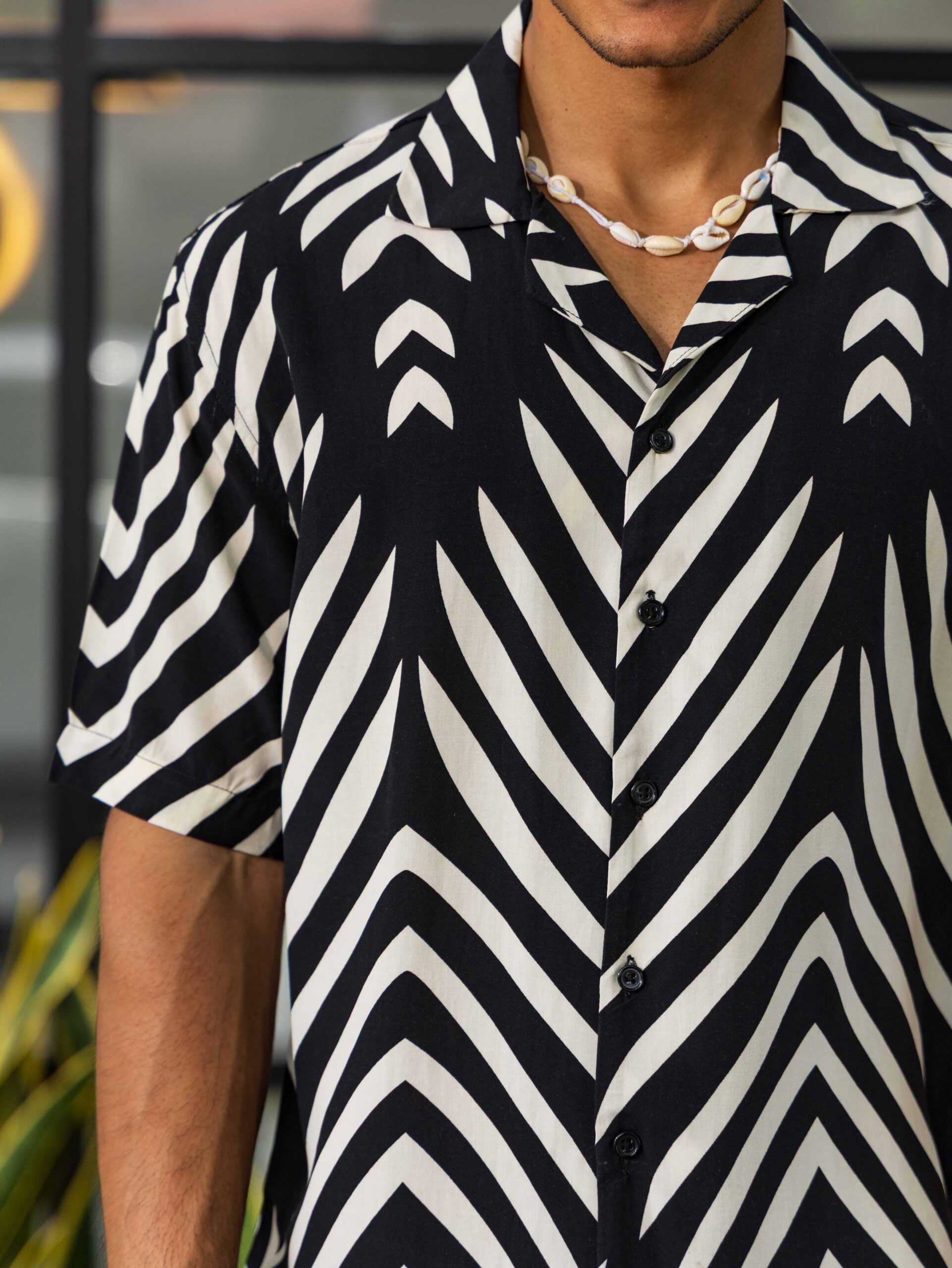 Crafted from a lightweight rayon blend, this Cuban collar shirt is soft, breathable, and perfect for island weather. Featuring a bold black & white chevron print, relaxed fit, and short sleeves, it’s designed for effortless style from beach days to city nights.